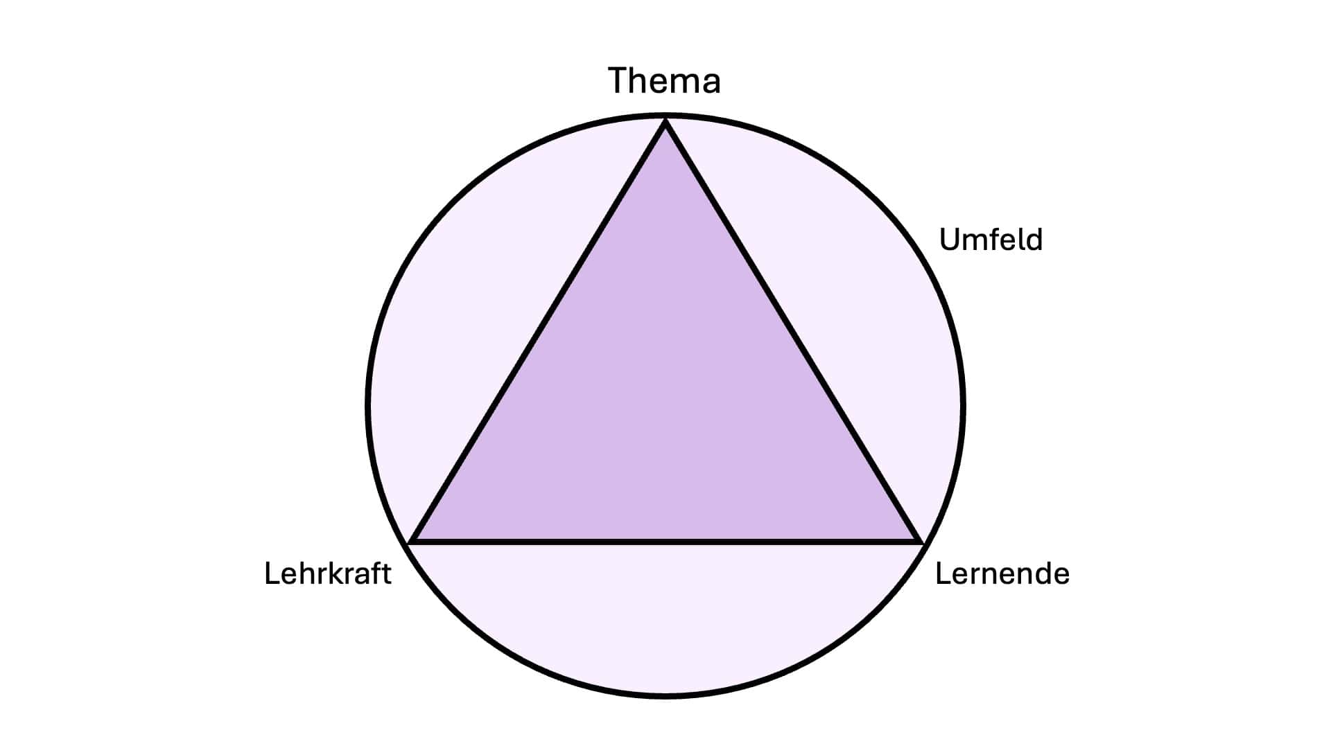 Das Modell zeigt ein gleichschenkliges Dreieck. Das Dreieck ist von einem Kreis umgeben. An der linken Spitze des Dreiecks steht das Wort Lehrkraft, an der rechten Spitze des Dreiecks steht das Wort Lernende. An der Spitze oben steht das Wort Thema. Am Kreis steht das Wort Umfeld.
