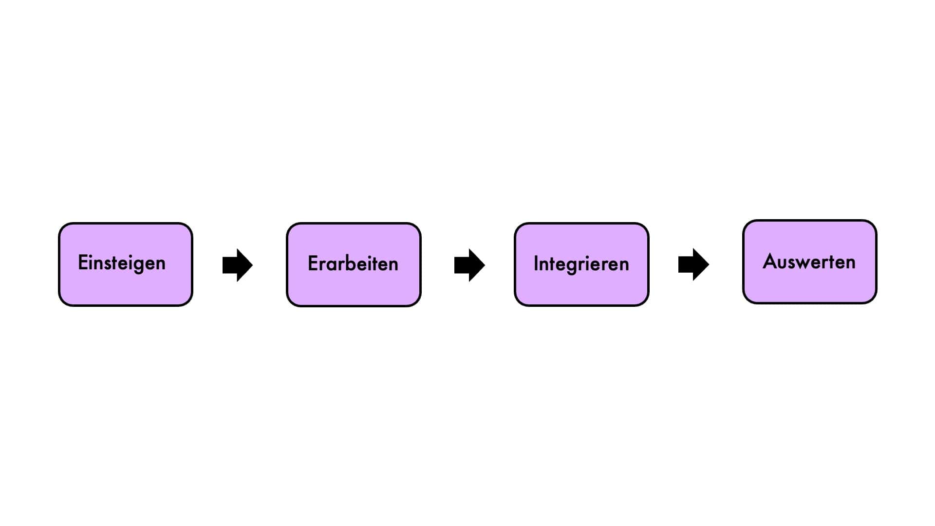 Im ersten Rechteck steht „Einsteigen“. Ein Pfeil zeigt auf das zweite Rechteck in dem „Erarbeiten“ steht. Ein weiterer Pfeil zeigt auf das dritte Rechteck, in dem „Integrieren“ steht. Ein weiterer Pfeil zeigt auf das vierte Quadrat, in dem „Auswerten“ steht.